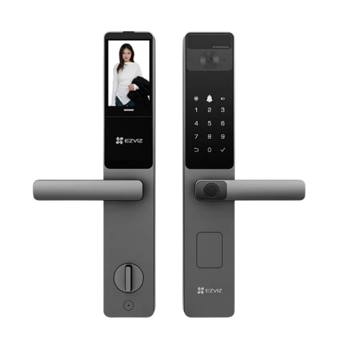 - Phương pháp mở khóa Nhận diện khuôn mặt, nhận diện vân tay, mã số, chìa cơ, chìa khóa Bluetooth qua ứng dụng EZVIZ, mã tạm thời, mở khóa từ xa.