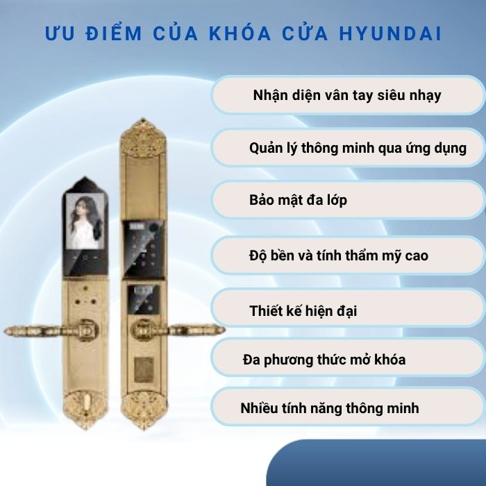 Các model như Hyundai HY-SLC8817, HY-SLC8818, HY-SLC8820 tích hợp công nghệ nhận diện vân tay 3D đa góc, mã hóa dữ liệu AES chống sao chép, cùng khả năng kết nối ứng dụng di động để quản lý ra vào từ xa. Tính năng khóa tự động, cảnh báo phá khóa, cảnh báo cháy và cảm biến nhiệt độ giúp bảo vệ toàn diện cho không gian sống.