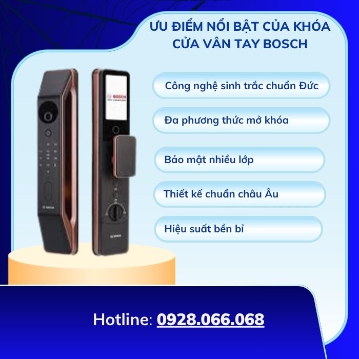 Trong kỷ nguyên của công nghệ thông minh, khóa cửa vân tay Bosch kết hợp hoàn hảo giữa độ an toàn tuyệt đối và thiết kế đẳng cấp châu Âu. Tại Việt Nam, các dòng khóa cửa thông minh Bosch đang được người tiêu dùng đánh giá cao nhờ độ tin cậy, khả năng bảo mật vượt trội và sự tương thích linh hoạt với nhiều loại cửa khác nhau.