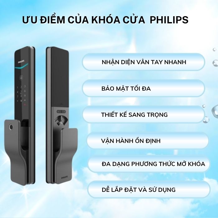 Các sản phẩm khóa Philips được phát triển dựa trên triết lý “An toàn – Tiện nghi – Thông minh”, tích hợp nhiều phương thức mở khóa tiên tiến như vân tay, mã số, thẻ từ, chìa cơ và ứng dụng di động. Với thiết kế sang trọng, độ bền cao và tiêu chuẩn bảo mật châu Âu, khóa cửa vân tay Philips không chỉ bảo vệ ngôi nhà tối ưu mà còn nâng tầm phong cách sống hiện đại cho người dùng.
